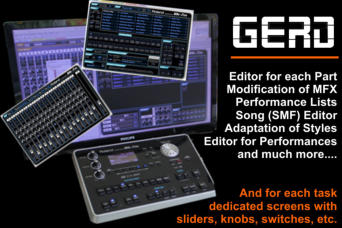 GERD is a graphical editor for the arrangers of Roland‘s BK series. Besides the intuitive control of all parameters you get additionally two more tone parts (UP3 and LW2) for the BK-7m. GERD can convert and edit various style formats and can save them in Roland‘s stl format to be used with all arrangers of Roland. The additional performance manager included in GERD helps you to organize your performance lists.